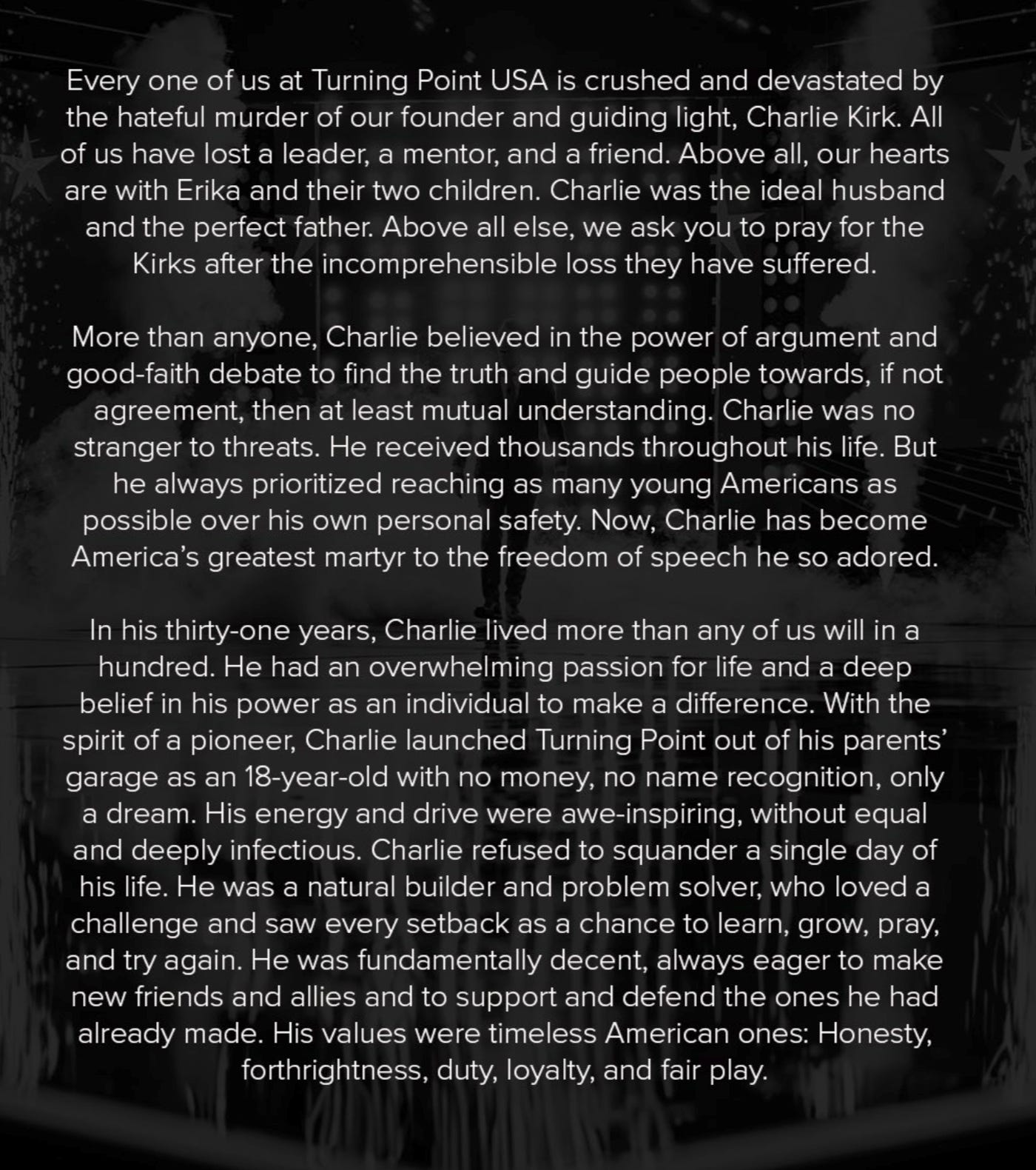 A free society derives upon vigorous debate without personal hatred. Charlie [Kirk] modeled that, and his example should be followed."